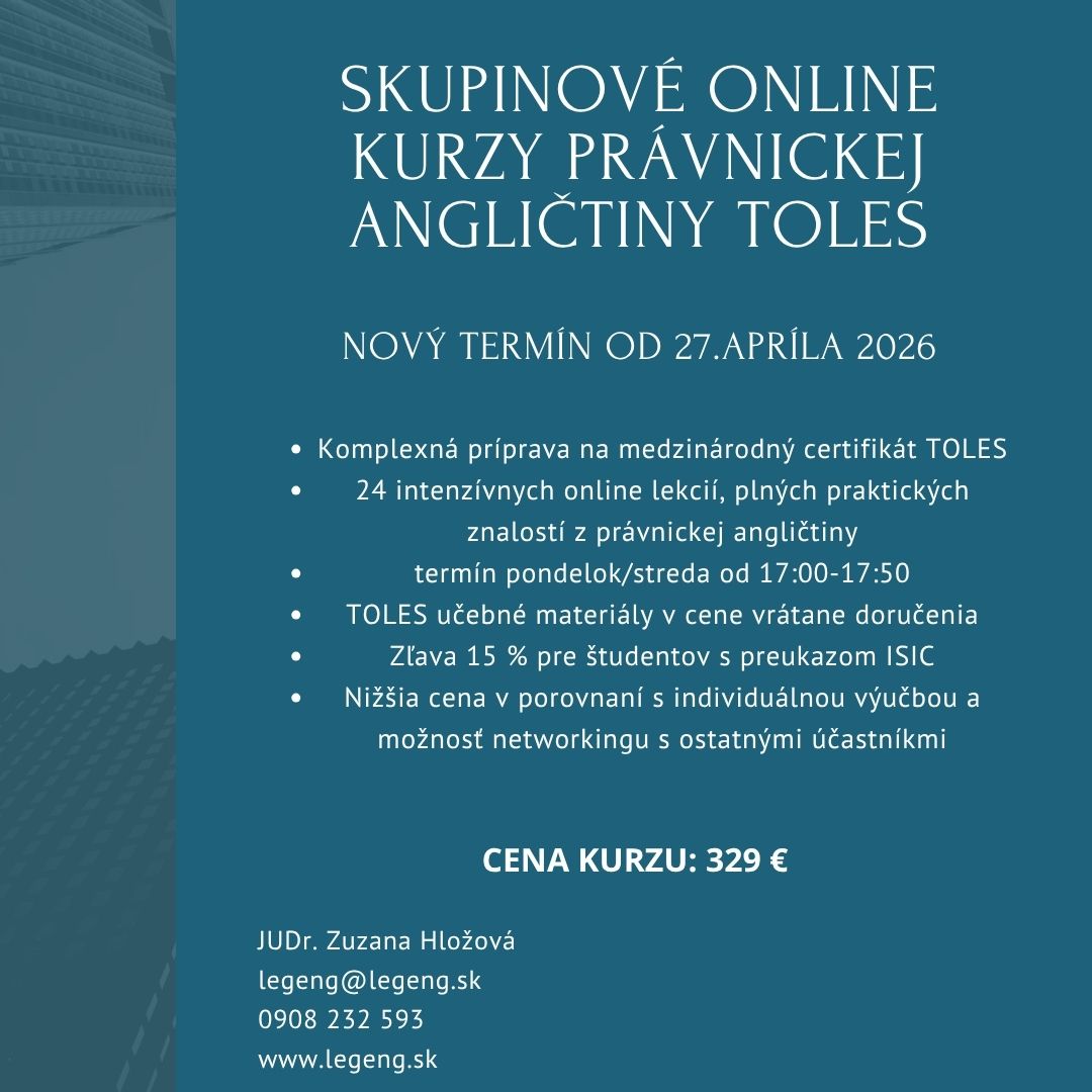 Vážené študentky, vážení študenti, dávame do pozornosti možnosť zúčastniť sa online kurzu právnickej angličtiny TOLES, ktorý zabezpečuje naša vyučujúca. Ide o prípravu na medzinárodný certifikát z právnickej angličtiny.