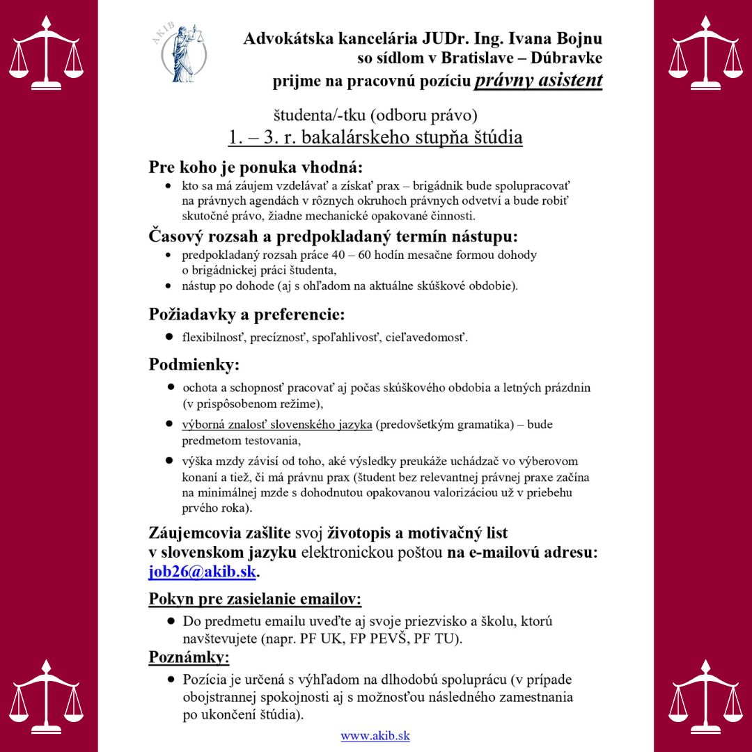 Ponuka práce pre študentov 1.-3. ročníka Bc. (právny asistent)