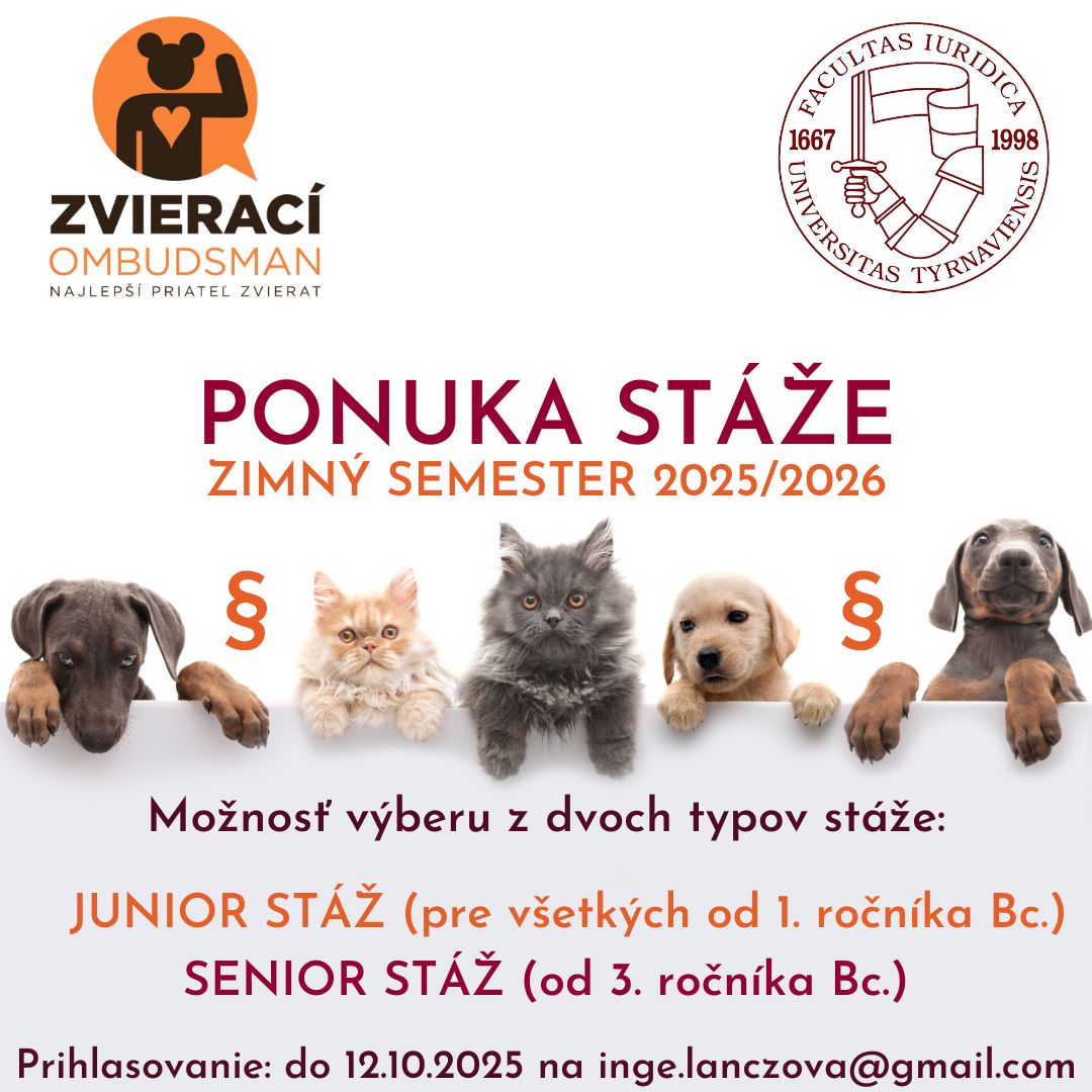 dávame Vám do pozornosti možnosť absolvovať dva typy stáží v organizácii Zvierací ombudsman v priebehu zimného semestra ak. roka 2025/2026