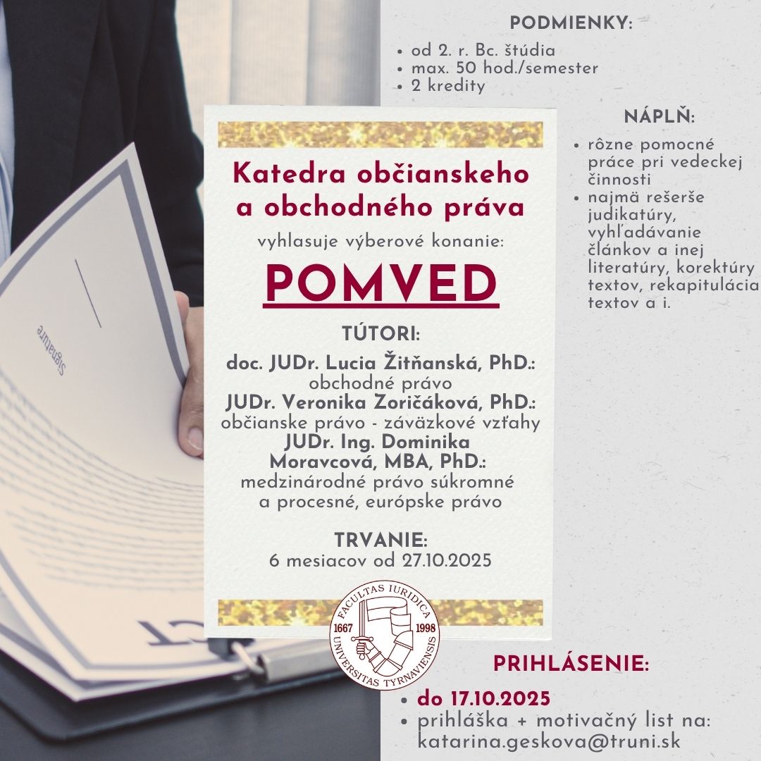Vážené študentky, vážení študenti, Katedra občianskeho a obchodného práva vyhlásila výberové konanie na pozíciu pomocnej študentskej vedeckej sily.