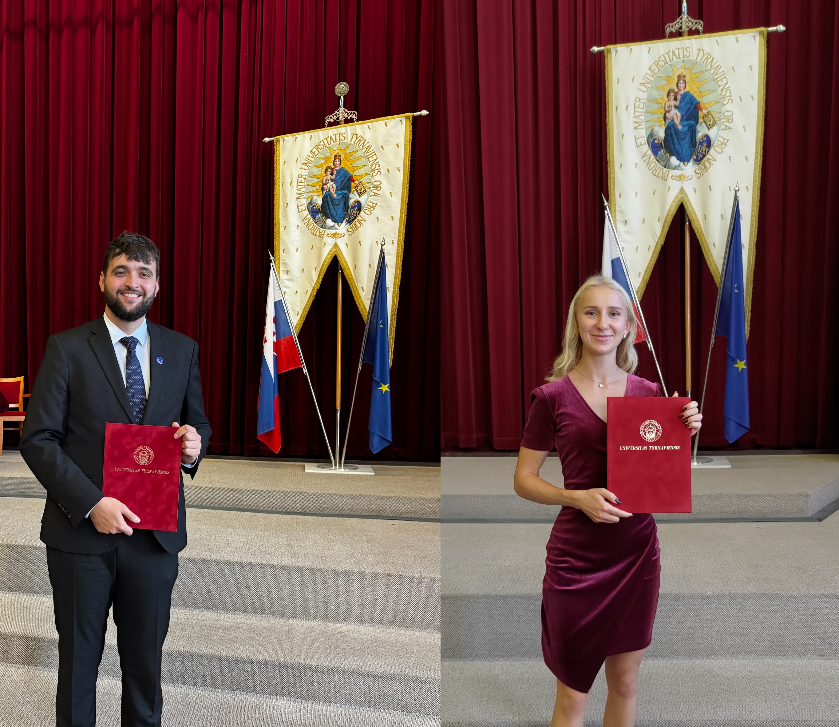 * fotografia je zo slávnostného otvorenia akademického roka 2025/2026, kde si študenti PF TU Peter Jarábek a Eva Gergelová prevzali Ocenenie rektora