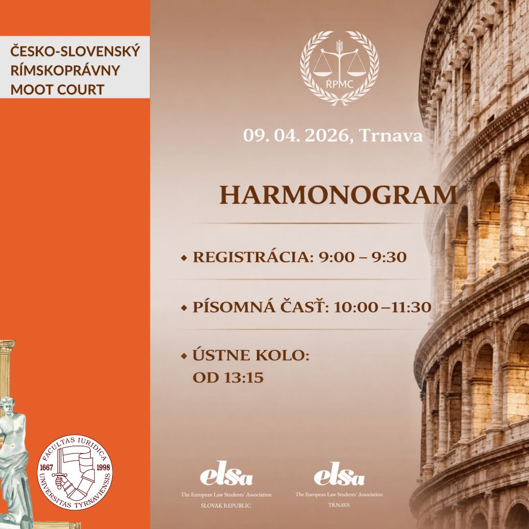 dávame do pozornosti možnosť prihlásiť sa na slovenské národné kolo rímskoprávneho moot courtu, ktoré sa uskutoční 9. apríla 2026 na našej fakulte! Tímy zložené z 1 – 3 členov majú možnosť zabojovať o vecné ceny pre víťazov a dva najlepšie tímy postúpia do medzinárodného kola v Českej republike, ktoré organizuje ELSA Brno spoločne s ELSA Česká republika. Súťaž je vhodná aj pre študentov prvého ročníka.