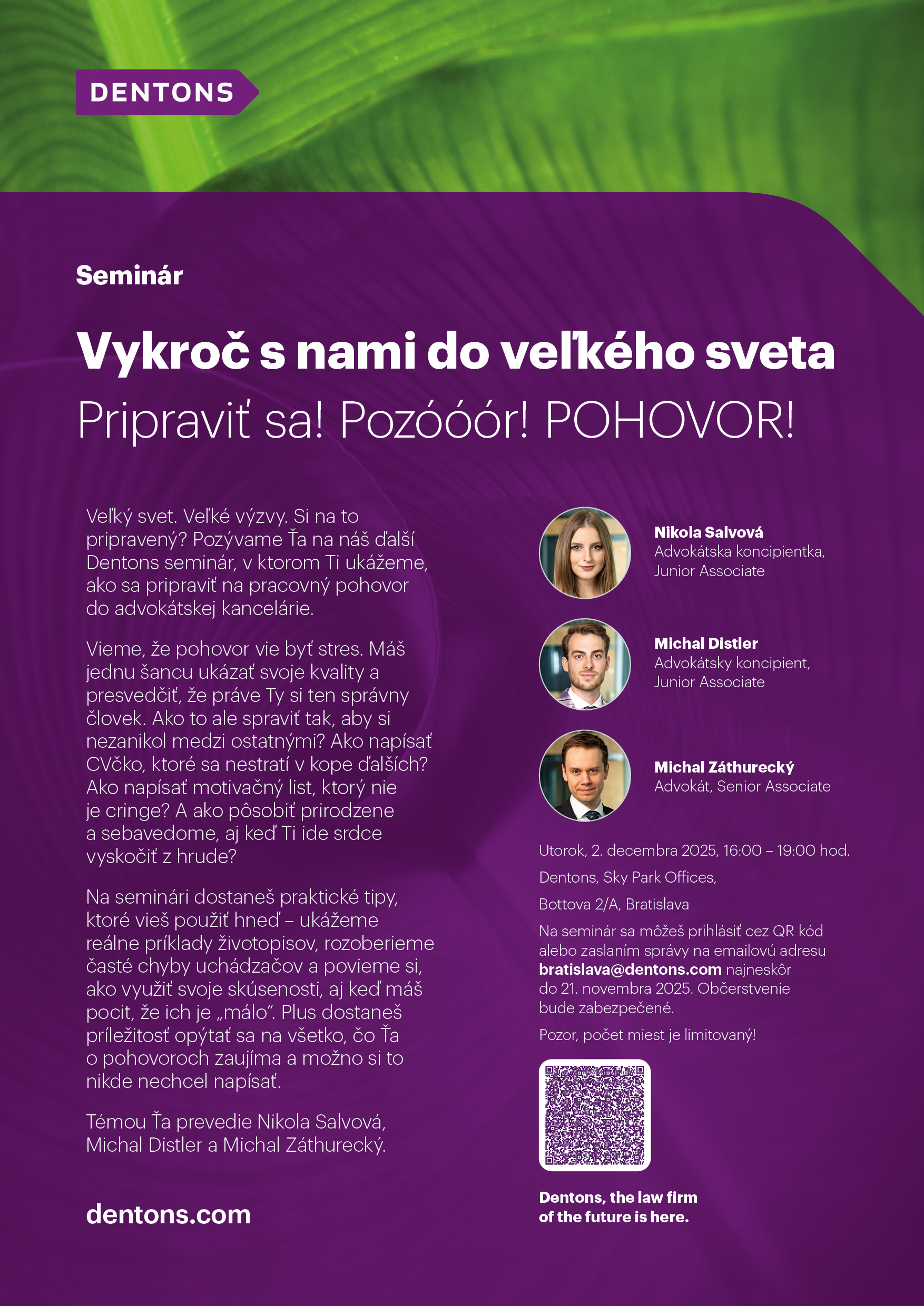 dávame do pozornosti ďalší zo série seminárov Dentons - Vykroč s nami do veľkého sveta. Najbližší seminár sa bude konať 2. decembra a bude zameraný na tému pracovného pohovoru do advokátskej kancelárie.