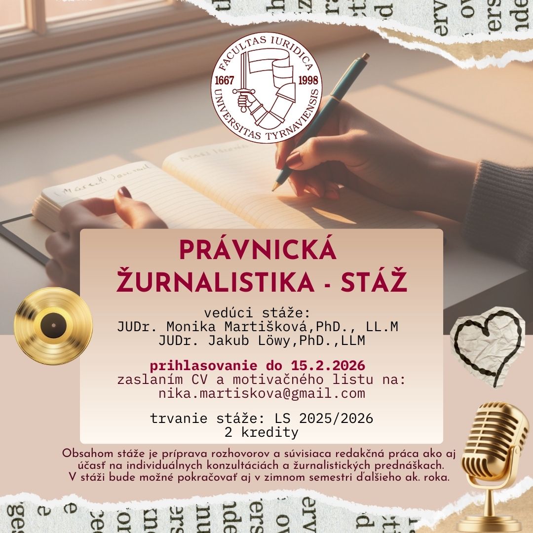 Milé študentky, milí študenti, dávame Vám do pozornosti možnosť absolvovať novú stáž na našej fakulte, a to stáž Právnickej žurnalistiky.