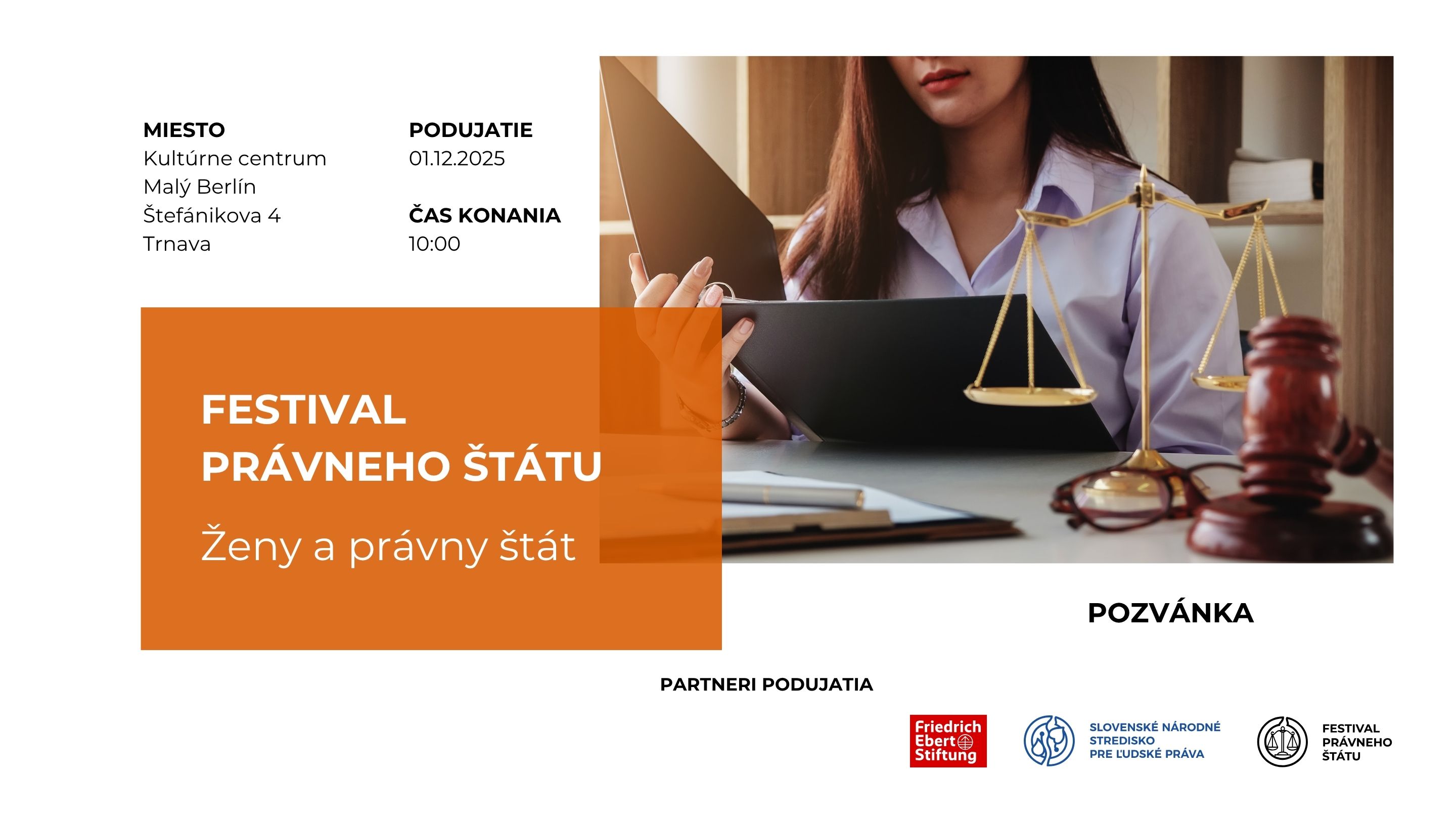 Pozývame Vás na predposlednú zo série odborných diskusií v rámci Festivalu právneho štátu 2025 o stave právneho štátu na Slovensku v kontexte ľudských práv. V pondelok, 1. decembra budeme od 10:00 v priestoroch Kultúrneho centra Malý Berlín (Štefánikova 4) v Trnave diskutovať o prístupe žien k spravodlivosti a k nástrojom ochrany, ktoré im ponúka právny štát.