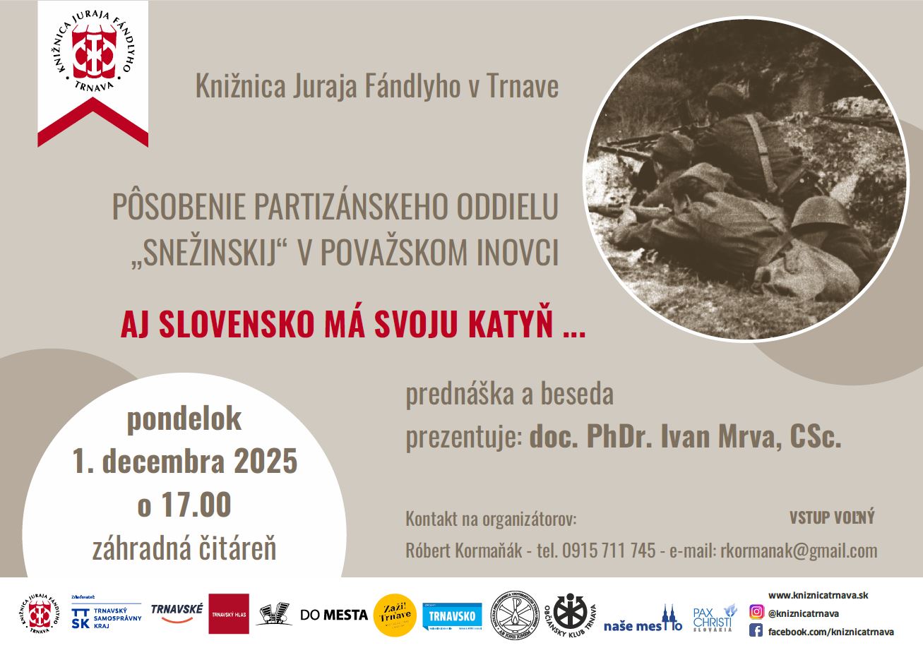 dovoľujeme si Vám v mene organizátorov poslať pozvanie na prednášku ,,Aj Slovensko ma svoju Katyň" o pôsobení partizánskeho oddielu ,,Boženko" v regióne západného Slovenska - prednášku vykoná renomovaný slovenský historik, doc. Ivan Mrva, PhD., ktorý dlhoročným výskumom zhromaždil dôkazy o desiatkach civilných obetí tejto partizánskej jednotky z radov obyvateľstva miest a obcí západného Slovenska. Po skončení prednášky sa bude konať beseda s prednášajúcim, kde bude možné klásť aj otvorené otázky k tejto citlivej téme.
