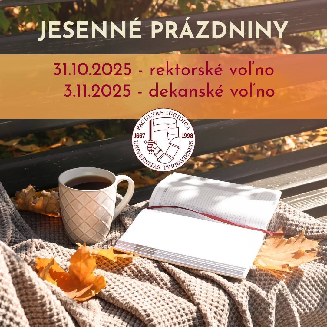 Vážené študentky, vážení študenti, pán rektor udeľuje na deň 31.10. 2025 (piatok) rektorské voľno a pani dekanka udeľuje na deň 3.11.2025 (pondelok) dekanské voľno. Prajeme Vám príjemné jesenné prázdniny.