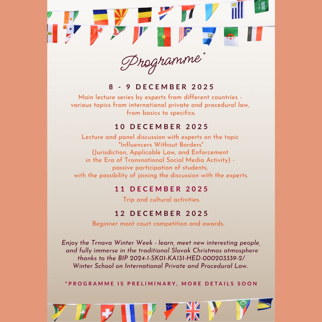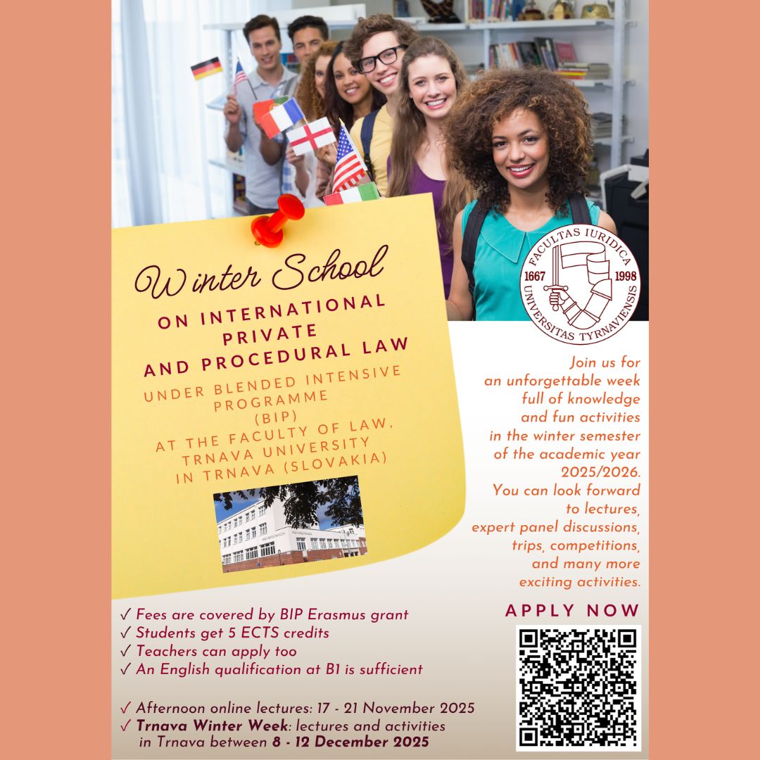 dávame do pozornosti možnosť prihlásiť sa na podujatie Winter School on International Private and Procedural Law, ktoré organizuje Katedra občianskeho a obchodného práva. Zimná škola sa skladá z poobedných online prednášok v dňoch 17. až 21. novembra a prezenčnej časti, ktorá sa uskutoční na našej fakulte v dňoch 8. až 12. decembra. Podujatie je uskutočňované ako súčasť BIP Erasmus projektu a po jeho úspešnom absolvovaní dostanú študenti a študentky 5 kreditov.